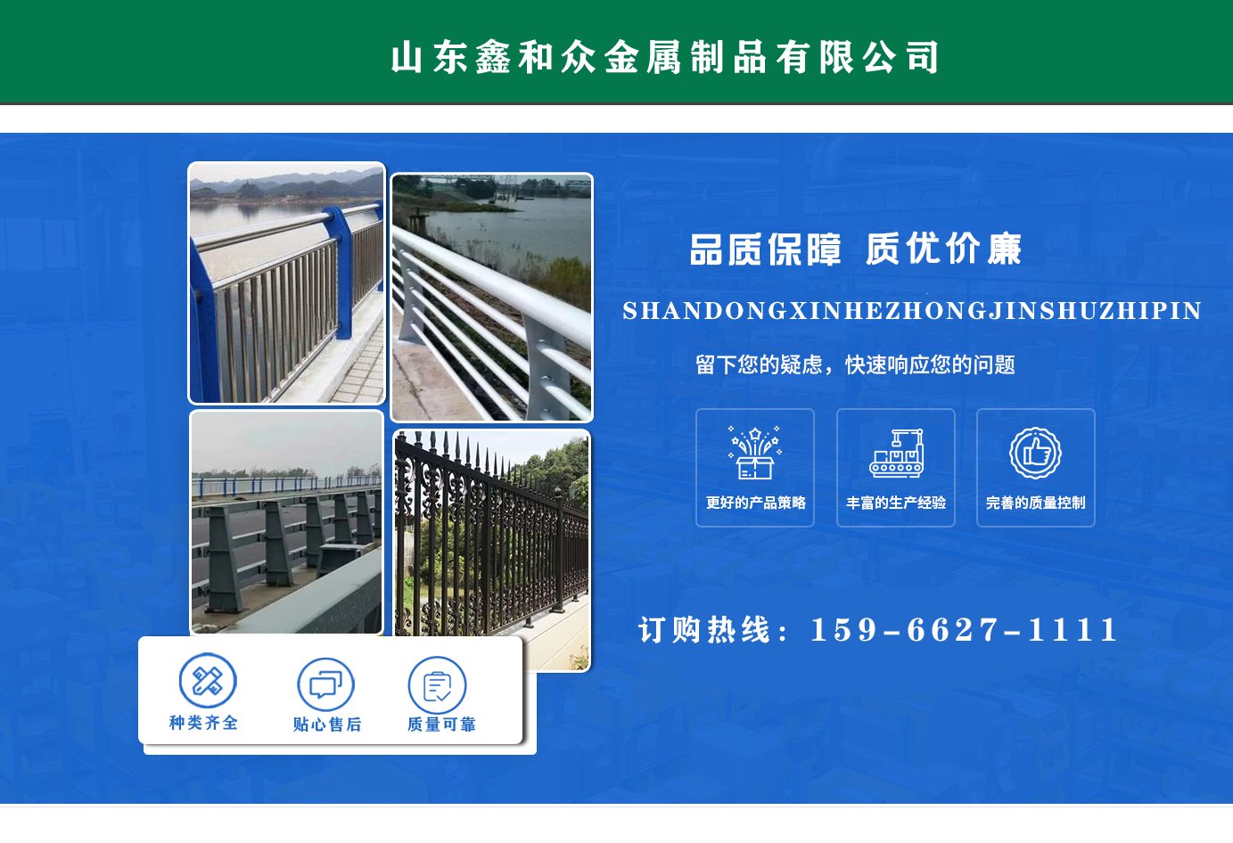 山東鑫和眾金屬制品有限公司主要產(chǎn)品有防撞護(hù)欄,橋梁護(hù)欄,道路護(hù)欄,河道護(hù)欄,不銹鋼護(hù)欄等護(hù)欄。提供設(shè)計方案,一站式定制,包您滿意價格優(yōu)惠,歡迎來電咨詢! 公司常年從事銷售護(hù)欄防撞護(hù)欄,橋梁護(hù)欄,道路護(hù)欄,河道護(hù)欄,不銹鋼護(hù)欄,橋梁鋼護(hù)欄,河道燈光護(hù)欄等。產(chǎn)品廣泛應(yīng)用于橋梁、河道、旅游景區(qū)、道路、公路、公園、小區(qū)、景觀、道路防撞等領(lǐng)域?! 」井a(chǎn)品均采用優(yōu)質(zhì)不銹鋼材料,符合相關(guān)標(biāo)準(zhǔn)。各種型號不銹鋼復(fù)合管及護(hù)欄,質(zhì)量嚴(yán)格把控。產(chǎn)品強(qiáng)度高、耐腐蝕、焊接牢固、抗沖擊、性能好,防撞護(hù)欄結(jié)構(gòu)簡單、美觀實用大方?! g迎前來訂購!...